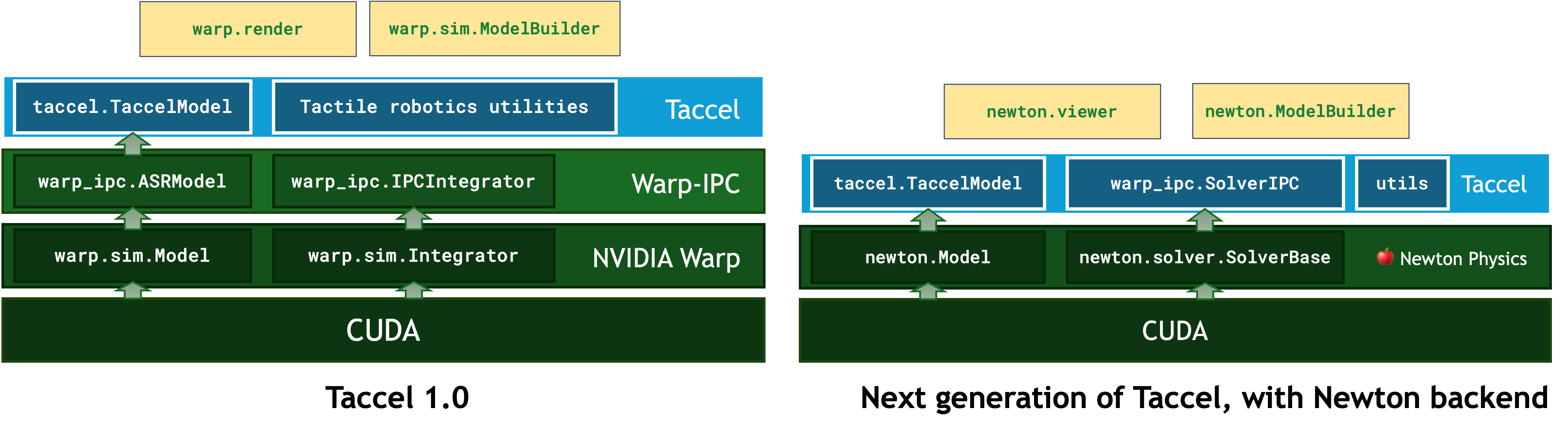Figure 2: Infrastructure of Taccel, including the warp.sim-based infra in the initial version and the target infra for Newton-based infra in the future release